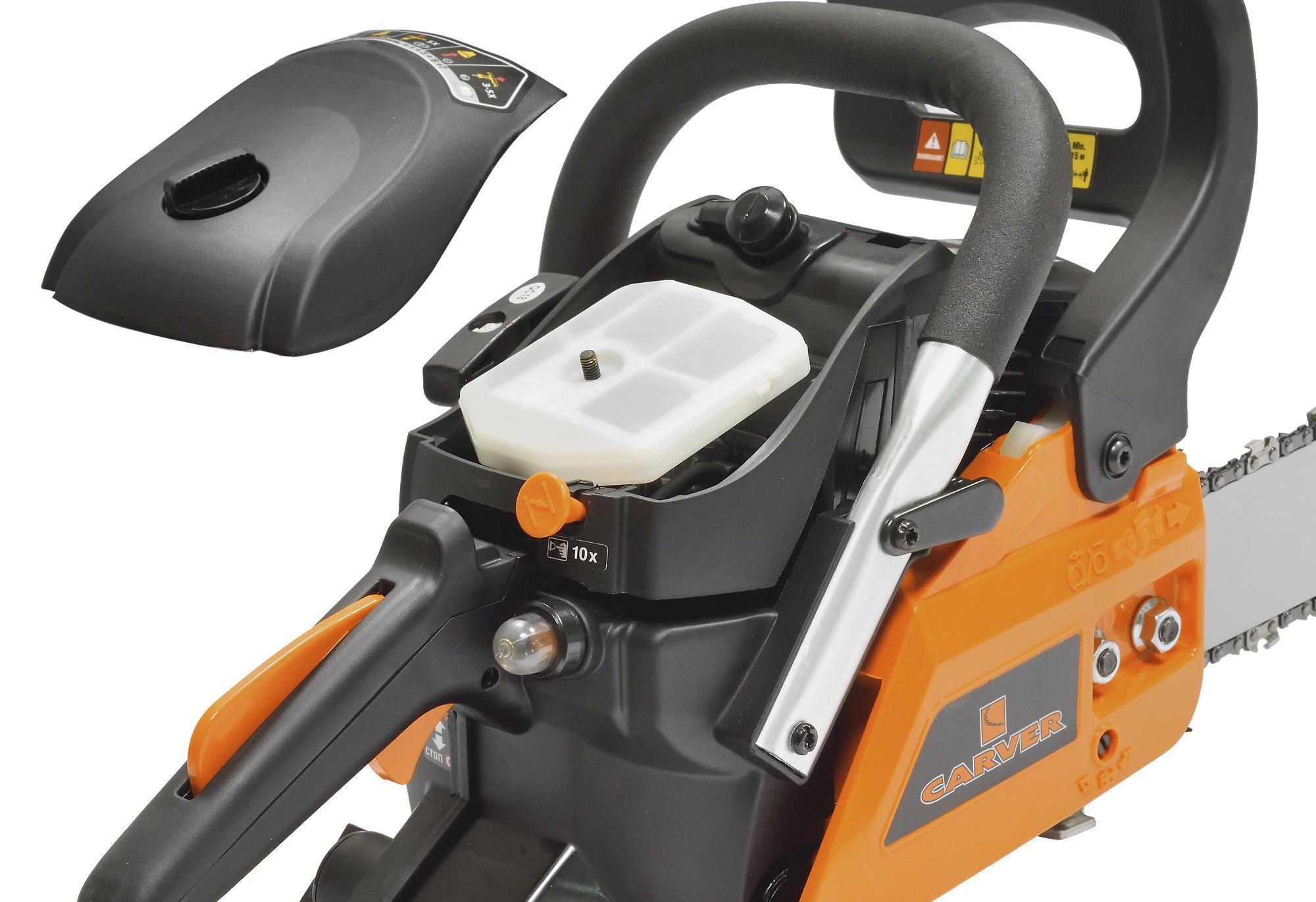 Бензопила Carver RSG 241Х оснащена системой QuickStart, компенсирующей противодействие двигателя при запуске. Отличная эргономика и многоточечная антивибрационная система гарантируют комфортную работу. Двигатель пилы выполнен в соответствии с международным стандартом EPA EU-II с использованием запатентованных систем AfterCharge и Clean2, сокращающих расход топлива до 20%, дающих прирост мощности до 5%, а крутящего момента до 17% по сравнению с аналогичными двухтактными двигателями. Технология пористого хромирования внутренней поверхности цилиндра двигателя обеспечивает увеличение износостойкости цилиндро-поршневой группы в 3-5 раз. Система экстренной остановки цепи создает высокий уровень безопасности. Высокопроизводительный пильный аппарат TM OREGON