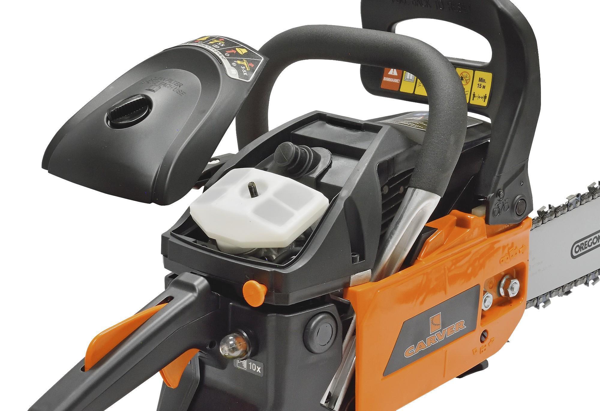 Бензопила Carver RSG 246 оснащена системой QuickStart, компенсирующей противодейсвие двигателя при запуске. Отличная эргономика и многоточечная антивибрационная система гарантируют комфортную работу. Двигатель пилы выполнен в соответствии с международным стандартом EPA EU-II с использованием запатентованных систем AfterCharge и Clean2, сокращающих расход топлива до 20%, дающих прирост мощности до 5%, а крутящего момента до 17% по сравнению с аналогичными 2-х тактными двигателями. Технология пористого хромирования внутренней поверхности цилиндра двигателя обеспечивает увеличение износостойкости цилиндро-поршневой группы в 3-5 раз. Система экстренной остановки цепи создает высокий уровень безопасности. Высокопроизводительный пильный аппарат TM OREGON