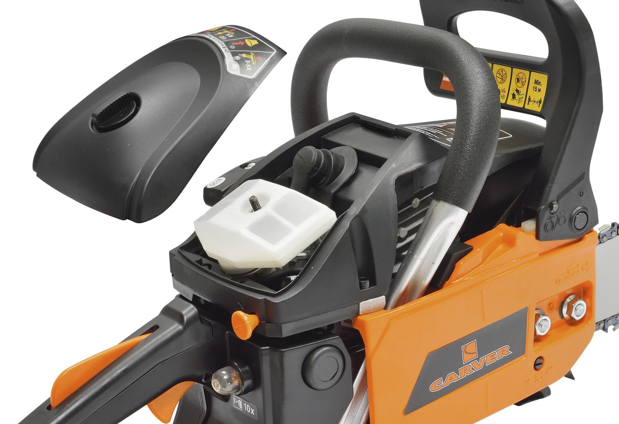Бензопила Carver RSG 252Х оснащена системой QuickStart, компенсирующей противодействие двигателя при запуске. Отличная эргономика и многоточечная антивибрационная система гарантируют комфортную работу. Двигатель пилы выполнен в соответствии с международным стандартом EPA EU-II с использованием запатентованных систем AfterCharge и Clean2, сокращающих расход топлива до 20%, дающих прирост мощности до 5%, а крутящего момента до 17% по сравнению с аналогичными двухтактными двигателями. Технология пористого хромирования внутренней поверхности цилиндра двигателя обеспечивает увеличение износостойкости цилиндро-поршневой группы в 3-5 раз. Система экстренной остановки цепи создает высокий уровень безопасности. Высокопроизводительный пильный аппарат TM OREGON