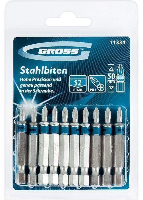 Набор бит торговой марки GROSS предназначен для использования в качестве насадок в ручном и механическом инструменте. Изготовлены биты из высококачественной инструментальной стали марки S2. Твердость бит составляет 58-62 HRС.Основу биты составляет шестигранный хвостовик размером 0,6 см (1/4 дюйма). Длина биты 50 мм, тип шлица — PZ3 (крестообразный с дополнительными направляющими). В качестве защиты от контрафакта на каждой бите присутствует цветное кольцо с логотипом торговой марки GROSS. Набор из десяти бит упакован в жесткую термоформованную пленочную коробку (double blister) размером 125×85 мм.