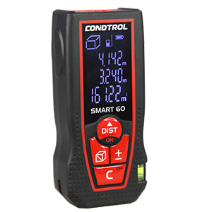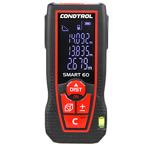 CONDTROL SMART 60 – лазерный дальномер, выполненный в эргономичном ударопрочном корпусе. Лазерная рулетка уверенно работает на расстоянии от 0,05 до 60 метров даже на улице. CONDTROL SMART 60 отличается высокой скоростью измерений, что позволяет быстро проводить необходимое количество расчетов. Погрешность измерения – всего 1,5 мм. Широкий функционал. CONDTROL SMART 60 автоматически рассчитывает площадь и объём, выполняет сложение, вычитание, имеет функцию непрерывного измерения (трекинг). Для проведения замеров в труднодоступных местах дальномер оснащён режимом «косвенного» измерения по теореме Пифагора. Пузырьковый уровень. Во время замера расстояния между вертикальными конструкциями (стены, оконные и дверные проемы, колонны) лазерный луч должен располагаться строго горизонтально относительно поверхности измерения. Несоблюдение этого условия ведёт к увеличению погрешности. Пузырьковый уровень, которым оснащён CONDTROL SMART 60, позволяет легко контролировать горизонтальное положение лазерной рулетки, благодаря чему можно получить максимально точные результаты. Дисплей с подсветкой. CONDTROL SMART 60 оснащён большим инверсионным дисплеем. Крупные цифры и символы на экране создают комфортные условия для работы даже в условиях плохого освещения. Защита от ударов. Высокопрочный пластиковый корпус с резиновым уплотнением защищают дальномер от случайных падений. Эргономичная форма и рельефная поверхность не дают лазерной рулетке скользить в руке.