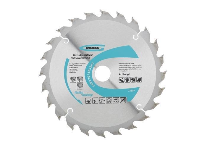 Пильный диск по дереву торговой марки GROSS предназначен для распиловки заготовок из мягких и твердых пород древесины, фанеры, ДСП. Изготовлен пильный диск из пружинной стали марки 65MN. Размеры диска 160 х 20 мм, с возможностью использовать переходник диаметром 16 мм. Форма зуба (ATB) с положительным углом наклона обеспечивает эффективную распиловку крупных заготовок. 24 режущие пластины изготовлены из твердого сплава, произведенного компанией CERATIZIT (Люксембург), и обладают исключительной стойкостью к окислению, истиранию и разрушению. Пайка пластины к диску осуществляется припоем с высоким содержанием серебра, гарантируя тем самым высокую надежность крепления.
