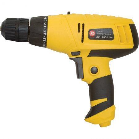 Ручная электрическая дрель с функцией шуруповёрта (сверлильная машина) Калибр ДЭ-550/2ШМ предназначена для сверления отверстий в цветных и чёрных металлах, пластмассах, дереве и других строительных материалах. Инструмент можно использовать для завинчивания и отвинчивания винтов, шурупов, саморезов при монтажных и строительных работах, как в производственных, так и бытовых условиях. Редуктор дрели имеет фрикцион (трещотку). В режиме шуруповёрта, при закручивании саморезов (шурупов, винтов), фрикцион срабатывает тогда, когда усилие достигло выбранного. Это предотвращает изнашивание бит и сохраняет шлицы саморезов. Дрель обладает возможностью изменения значения скорости: I или II.