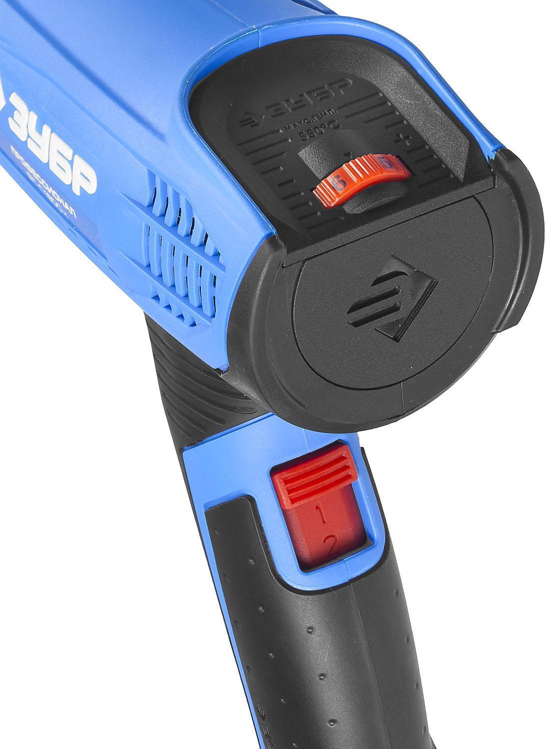 Изделие профессионального уровня на новой технологической базе; — Два режима работы с разными температурой и потоком; — Благодаря электронной регулировке температуры, воздушного потока и потребляемой мощности, возможна работа с различными материалами; — Ступень холодного обдува позволяет плавно охладить нагревательный элемент по окончании работы, что многократно продлевает его ресурс; — Новая схема воздушного потока увеличивает КПД фена; — Керамический изолятор обеспечивает защиту нагревательного элемента и обрабатываемой поверхности; — Увеличенные диаметры нагревательных нитей гарантируют высокий ресурс; — 4 различные насадки в комплекте позволяют выполнять любую работу – от точечного нагрева до сушки больших площадей; — Термопредохранитель для защиты изделия и нагревательного элемента от выхода из строя из-за перегрева; — Плоская тыльная часть фена и специальный упор на рукоятке позволяют использовать фен в стационарном положении; — Конструкция воздушных каналов предотвращает попадание в фен крупных инородных частиц.
