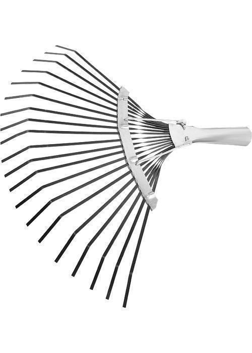 Грабли веерные усиленные, 20 плоских зубьев, охват рабочей части 400 мм. Тулейка внутренним диаметром 25 мм. Расположенная сверху распорка усиливает пружинящий эффект и дополнительно упрочняет конструкцию. Предназначены для сбора опавшей листвы, срезанных веток, сорняков, садового мусора. Зубья выполнены из пружинной стали 65Г и имеют повышенную жесткость, что обеспечивает удобство в работе. Оксидирование зубьев защищает от коррозии.