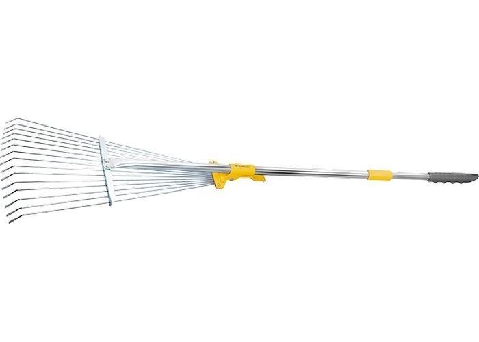 Грабли веерные регулируемые, 15 круглых, сплющенных на концах зубьев, охват рабочей части от 190 до 550 мм. Алюминиевый телескопический черенок с двухкомпонентной ручкой на конце. Длина черенка изменяется в диапазоне 500 мм. Зубья закреплены на подвижной, скользящей по черенку втулке, которая фиксируется эксцентриковым зажимом в любом положении, изменяя ширину захвата. Предназначены для сбора опавшей листвы, срезанных веток, сорняков, садового мусора. Круглые жесткие зубья позволяют использовать грабли для аэрации почвы. Зубья выполнены из пружинной стали 65Г и имеют повышенную жесткость, что обеспечивает удобство в работе. Оцинковка зубьев защищает от коррозии.