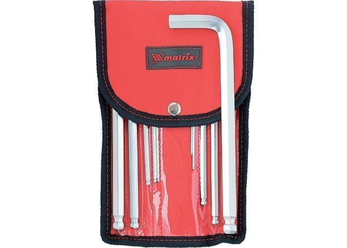 Набор удлиненных имбусовых ключей торговой марки MATRIX предназначен для работы с крепежом, оснащенным шлицом HEX (шестигранником). Ключи имеют Г-образную форму, изготовлены из высококачественной хромованадиевой стали твердостью 50 HRС. Сатинированное покрытие инструмента позволяет надежно удерживать ключи при высоком крутящем моменте. Шарообразный наконечник ключей позволяет выполнять работы под углом в труднодоступных местах. В состав набора входят ключи размером 1.5, 2, 2.5, 3, 4, 5, 6, 8, 10 и 12мм. Ключи упакованы в тканевый чехол с петлей для крепления на поясе. Чехол закреплен на картонной карте для размещения инструмента на стенде.