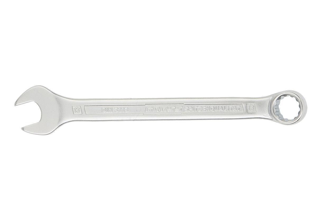 Ключ комбинированный торговой марки GROSS предназначен для монтажа/демонтажа резьбовых соединений. Изготовлен из высококачественной хромованадиевой (Crv) стали методом холодного штампа.Твердость 45-48 HRC. Ключ с одной стороны оснащен захватом открытого типа — рожковым и накидным (кольцевым) с другой стороны. Профиль кольцевого зева имеет 12 граней, что увеличивает площадь соприкосновения рабочих поверхностей и снижает риск деформации граней крепежа при монтаже. Угол наклона кольцевого зева относительно плоскости ключа в 15 градусов делает монтаж более удобным. Хромоникелевое покрытие ключа улучшает антикоррозийные свойства инструмента.