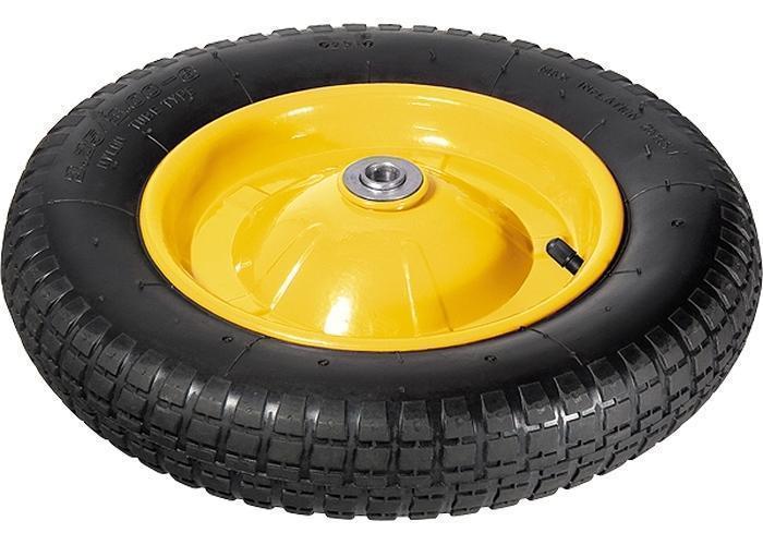 Колесо пневматическое с камерой диаметром 360 мм. Диск стальной неразборный толщиной 0,7 мм диаметром 230 мм, имеет порошковую окраску. Внутренний диаметр подшипника 16 мм (посадочный размер). Покрышка двухслойная с протектором. Точечная сварка половинок по всей окружности. Края диска закругленные. Два стальных шариковых подшипника. Колесо арт. 68940 подходит для тачек 68910, 68915; колесо арт. 68943 – для 68922.