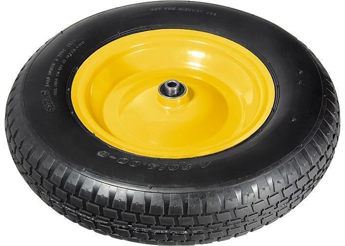 Колесо пневматическое с камерой диаметром 360 мм. Диск стальной неразборный толщиной 0,7 мм диаметром 230 мм, имеет порошковую окраску. Внутренний диаметр подшипника 16 мм (посадочный размер). Покрышка двухслойная с протектором. Точечная сварка половинок по всей окружности. Края диска закругленные. Два стальных шариковых подшипника. Колесо арт. 68940 подходит для тачек 68910, 68915; колесо арт. 68943 – для 68922.
