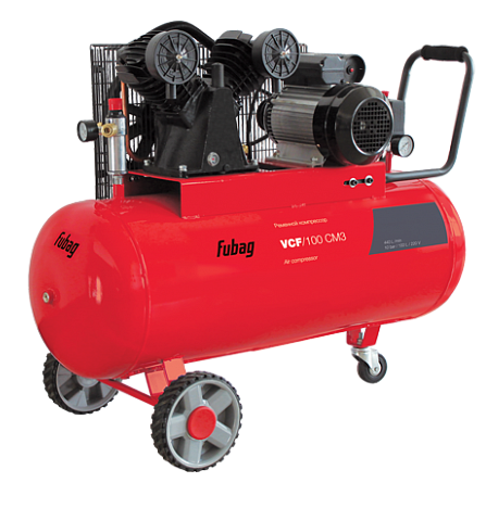 Двухцилиндровый поршневой масляный ременной одноступенчатый компрессор Fubag VCF/100 CM3 производительностью 440 л/мин, мощностью 2,2 кВт, ресивером на 100 л. — рекомендован для всех видов работ на небольших производствах.