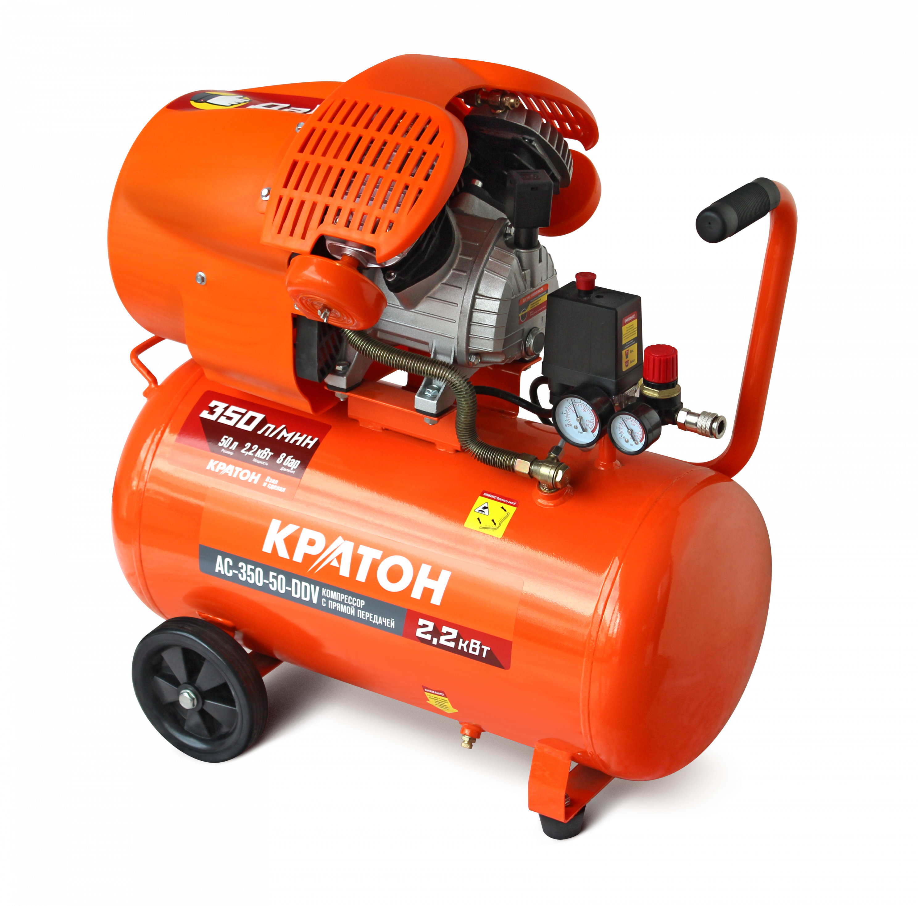 Компрессор с прямой передачей Кратон AC-350-50-DDV Двухцилиндровая модель с высокой производительностью, рукоятка, ручка и колеса для перемещения на небольшие расстояния;