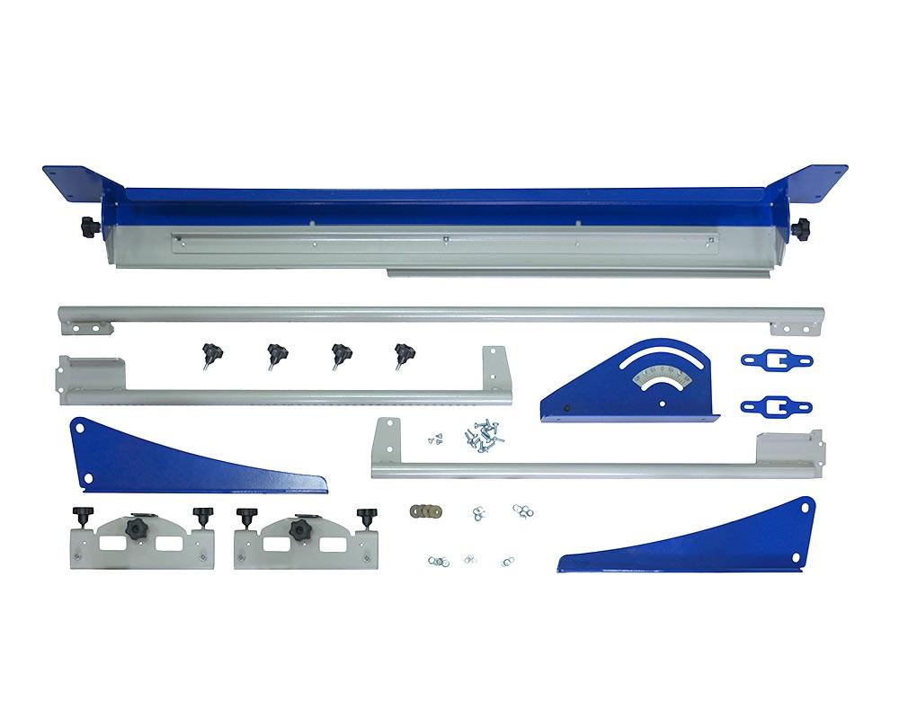 Она состоит из трех направляющих и кронштейнов, закрепленных вокруг рабочих столов. В комплекте имеются две каретки с роликами, они легко перемещаются вдоль пильного и строгальных столов. На каретки винтами-барашками крепится полнопрофильная направляющая линейка. Ее используют как при строгании, так и при распиловке.