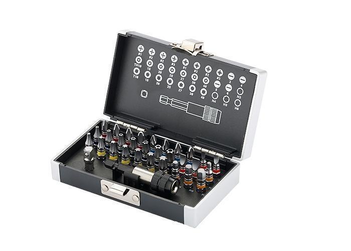 Набор бит торговой марки GROSS предназначен для монтажа/демонтажа резьбовых соединений при проведении слесарно-монтажных работ. В наборе 30 бит, изготовленных из высококачественной инструментальной стали S2, со шлицами PH1, PH2, PH3, PZ1, PZ2, PZ3, T10, T15, T20, T25, T27, T30, T40, H3, H4, H5, H6, SL3, SL4, SL5, SL6, ТН10, ТН15, ТН20, ТН25, ТН27, ТН30 и ТН40, которые являются наиболее востребованными при проведении различных работ. Для соединения разных типоразмеров в наборе предусмотрен переходник с шестигранника на квадрат длиной 25 мм. Со стороны квадрата в переходнике установлен металлический шарик-фиксатор. Битодержатель из хромированной стали снабжен магнитом, который предотвращает выпадение бит во время работы.