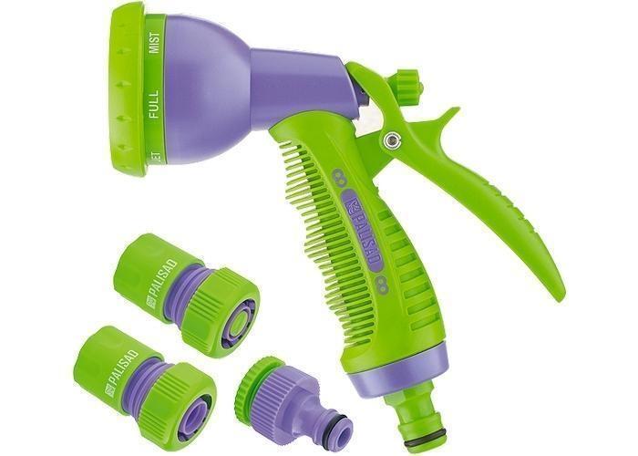Поливочный набор из 4 предметов. Предназначен для подключения шланга 3/4" к системе полива: 1. Распылитель, материал: прочный АБС-пластик. Благодаря регулируемой головке, имеет шесть режимов полива: душ, туман, конусная струя, центральная струя, плоско-горизонтальная струя, жесткая струя, что позволяет выбрать наиболее подходящий режим для любого типа посадок, а также для очистки. Имеется фиксатор курка для непрерывной работы. 2. Быстросъемный соединитель 3/4", материал: прочный АБС-пластик. Надевается на шланг. Позволяет быстро и многократно подсоединять/отсоединять шланг к системе полива через адаптер-переходник. 3. Быстросъемный соединитель 3/4" с функцией аквастопа, материал: прочный АБС-пластик. Надевается на шланг. Позволяет быстро и многократно подсоединять/отсоединять распылитель к шлангу. За счет функции аквастопа подача напора автоматически прекращается при отсоединении распылителя от шланга и возобновляется при подсоединении. 4. Адаптер-переходник 1/2"―3/4", внутренняя резьба, материал: прочный АБС-пластик. Накручивается на магистральный отвод водопровода соответствующего диаметра. Совместим со всеми элементами системы полива PALISAD и PALISAD Luxe.
