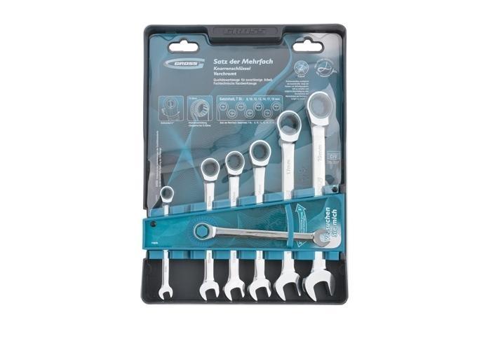 Набор комбинированных ключей торговой марки GROSS предназначен для монтажа/демонтажа резьбовых соединений. Ключи набора изготовлены из высококачественной хромованадиевой (Crv) стали. В набор входит семь ключей размером от 8 до 19 мм. Каждый ключ с одной стороны оснащен захватом открытого типа — рожковым и накидным (кольцевым) с другой стороны. Сторона с накидным типом захвата оборудована храповым механизмом, который позволяет проводить быстрый монтаж резьбовых соединений. Хромоникелевое покрытие ключей улучшает антикоррозийные свойства инструмента. Упакован набор в термоформованную пленочную коробку (double blister).