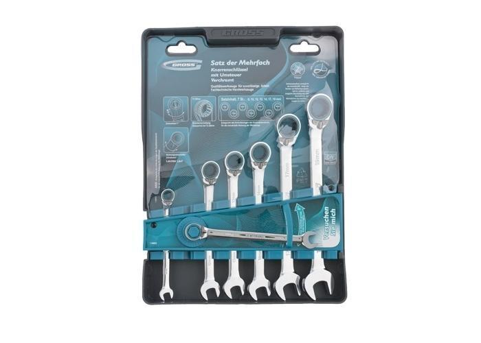 Набор комбинированных ключей торговой марки GROSS предназначен для монтажа/демонтажа резьбовых соединений. Ключи набора изготовлены из высококачественной хромованадиевой (Crv) стали. В набор входит семь ключей размером от 8 до 19 мм. Каждый ключ с одной стороны оснащен захватом открытого типа — рожковым и накидным (кольцевым) с другой стороны. Сторона с накидным типом захвата оборудована реверсивным храповым механизмом, который позволяет проводить быстрый монтаж резьбовых соединений. Хромоникелевое покрытие ключей улучшает антикоррозийные свойства инструмента. Упакован набор в термоформованную пленочную коробку (double blister).
