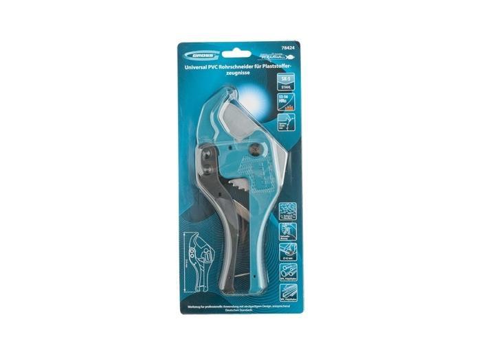 Ножницы торговой марки GROSS предназначены для резки пластиковых труб, плинтусов, профилей, резиновых шлангов и пр. диаметром до 42 мм. Прямая форма рабочего ножа позволяет резать и плоские изделия из вышеуказанных материалов. Корпус ножниц из сверхпрочного алюминиевого сплава, лезвие из высокоуглеродистой стали SK2 и усовершенствованный храповой механизм позволяют отнести инструмент к профессиональной линейке.
