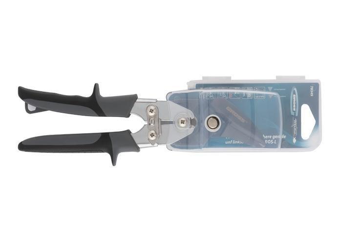 Ножницы по металлу торговой марки GROSS предназначены для проходного прямого и левого реза листового металла толщиной до 1,57 мм и нержавеющей стали толщиной до 0,94 мм. Рабочие части ножниц изготовлены из высоколегированной стали (CrMo), содержание молибдена и ванадия в ее составе придает необходимую жесткость и высокую твердость. Режущие губки проходят процесс индукционной закалки и имеют твердость 60–62 HRС. Ножницы общей длиной 255 мм оснащены эргономичными двухкомпонентными рукоятками, оригинальная форма которых минимизирует риск травм и обеспечивает удобство при длительных работах.