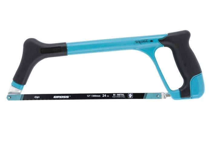 Ножовка по металлу PIRANHA торговой марки GROSS предназначена для проведения слесарных работ (резки профильного металла, труб и пр.). Трехкомпонентная металлопластиковая рама со стальным сердечником позволяет устанавливать полотно под углом 45° и 90°. Обрезиненная рукоятка удобно и надежно фиксируется в руке, тем самым повышая эффективность инструмента в работе. Скрытый в рукоятке винтовой механизм обеспечивает оптимальное натяжение полотна (150 KGF/30000 PSI) для получения прямого и аккуратного пропила. Ножовка комплектуется биметаллическим полотном с зубьями из быстрорежущей стали. Длина полотна 300 мм, шаг зуба 24 TPI (24 зуба на дюйм, 1 дюйм = 2,54 см).