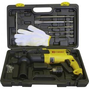 Ручной электрический перфоратор Калибр ЭП-800/26М, среднего класса, с возможностью работы в трёх режимах(«сверление»/ «сверление с ударом»/ «удар»), относится к изделиям бытового назначения. Перфоратор предназначен для ударного сверления отверстий в бетоне, кирпиче и камне, а также для лёгких долбёжных работ (скалывание керамической плитки, вырубка ниш, штробление каменных поверхностей и т.п.). Кроме того инструмент можно использовать в режиме сверления отверстий в цветных и чёрных металлах, пластмассах, дереве и других строительных материалах. На перфораторе установлен патрон SDS-plus, в комплект поставки входит: ключевой патрон 1,5-13 мм, посадка 1/2“ 20-UNF и переходник с SDS-plus на сверлильный патрон, дополнительная рукоятка и ограничитель глубины сверления.