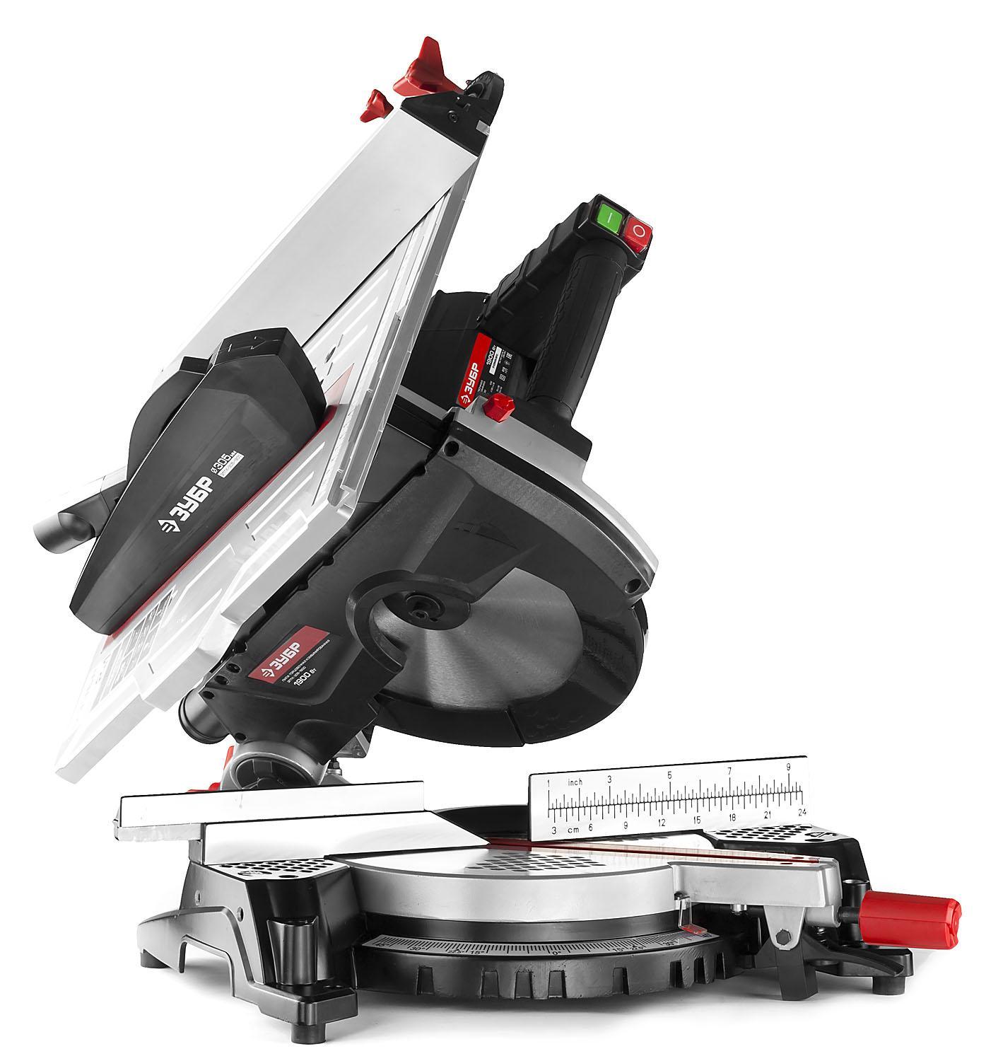 Торцовочная пила — защитные блокировки кожуха и выключателя — поворотный стол и регулировка угла наклона пиления — возможность подключения пылесоса или мешка для сбора пыли