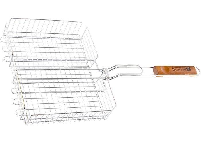 Высококачественная жаропрочная сталь. Эргономичная рукоятка. Широкое кольцо-фиксатор. Конструкция объемной решетки-гриль позволяет фиксировать верхнюю плоскость на разной высоте, поэтому на решетке можно запекать продукты различной толщины — от стейков до куринных окорочков, не передавливая их и оставляя сочными.