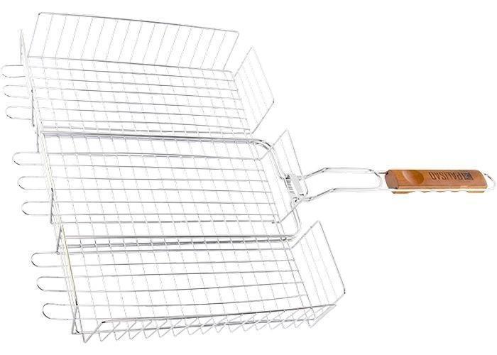 Высококачественная жаропрочная сталь — Эргономичная рукоятка — Широкое кольцо&фиксатор Конструкция объемной решетки&гриль позволяет фиксировать верхнюю плоскость на разной высоте, поэтому на решетке можно запекать продукты различной толщины — от