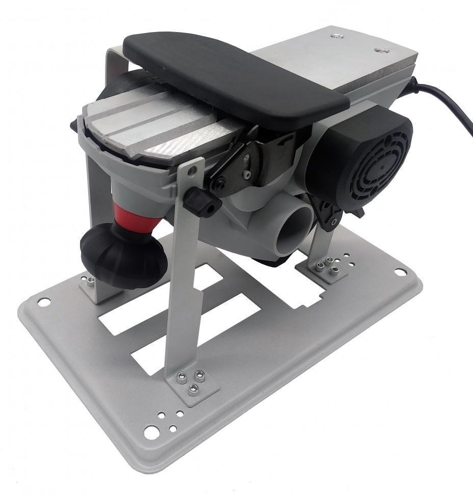 Для поддержания рабочего места в чистоте, инструмент оснащен патрубком для отвода пыли. С помощью широкой рукоятки можно не только крепко удерживать инструмент во время работы, но и регулировать глубину строгания от 0 до 3 мм. Для удобства работы продолжительное время на рукоятке предусмотрен фиксатор пусковой клавиши. Воздушное охлаждение исключает возможность перегрева в течение работы.