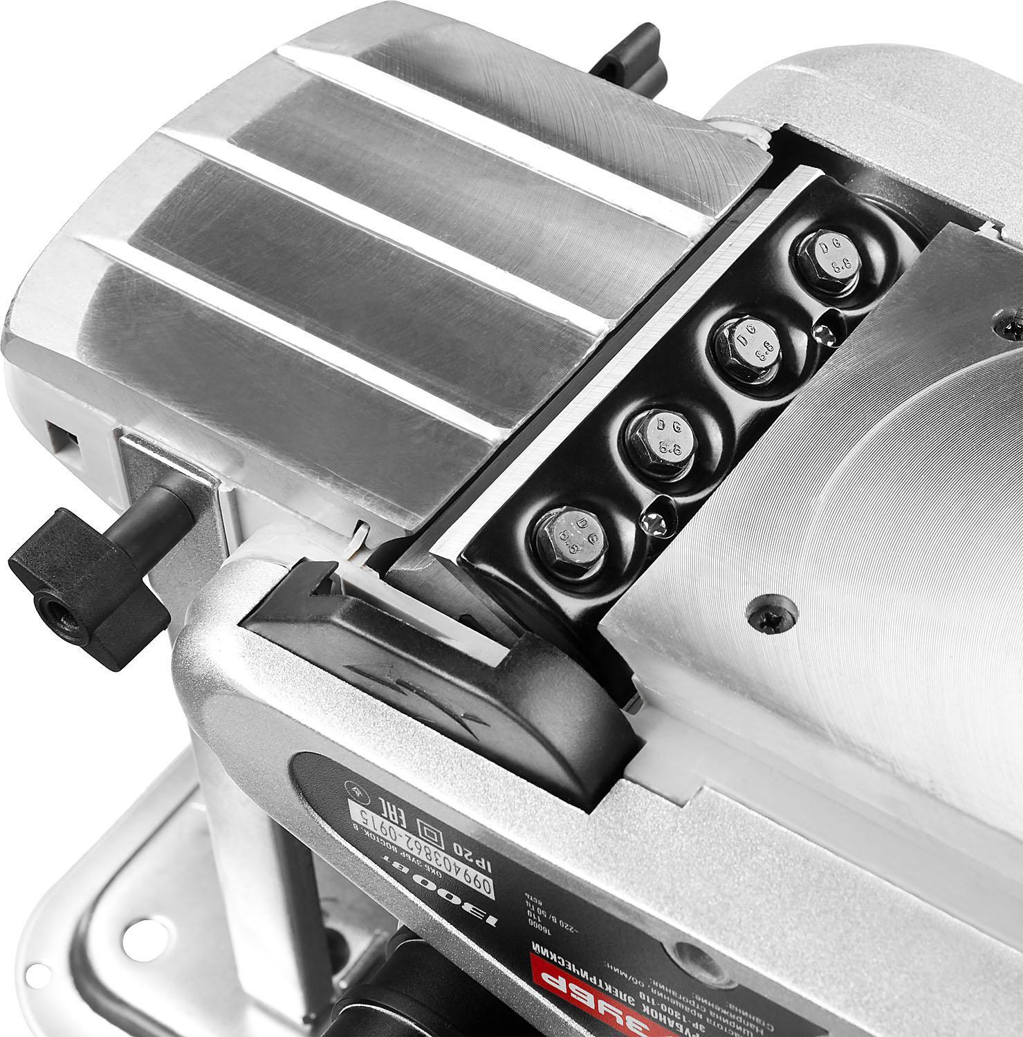 - Мощный электродвигатель, позволяющий строгать без рывков и перегрева; — Ширина строгания за один проход 110 мм; — Набор для установки в стационарное положение; — Электронная система плавного пуска, поддержания оборотов под нагрузкой и защиты от перегрузки; — Выборка паза с краю заготовки (выборка четверти); — Точная регулировка глубины строгания с шагом 0.1 мм; — Отдельная дополнительная рукоятка, не совмещенная с настройкой глубины, позволяет не сбивать выставленную глубину при работе; — Настраиваемый выброс опилок влево или вправо; — Два ножа из быстрорежущей стали, установленные под углом к обрабатываемой поверхности; — 3 V-образных паза разной глубины для снятия фасок; — Литые подошвы гарантируют точность геометрии весь срок службы; — Ременная передача между двигателем и режущим барабаном препятствует повреждению двигателя при ударных нагрузках на барабан; — Блокировка выключателя предотвращает случайное включение инструмента; — Откидной башмак для защиты обрабатываемой детали от вращающихся ножей; — Возможность подключения к пылесосу.