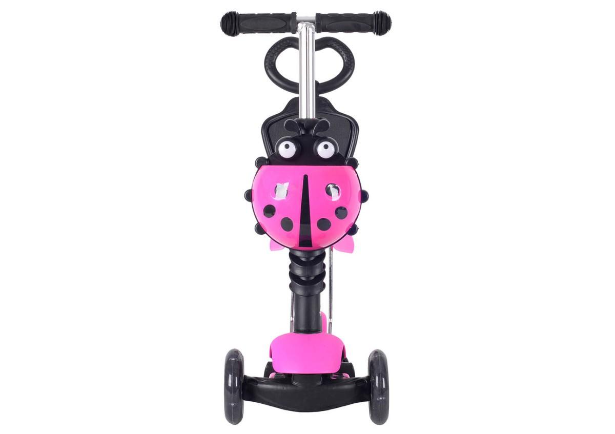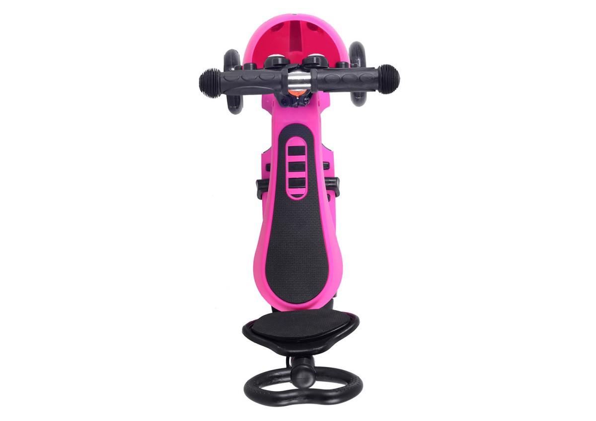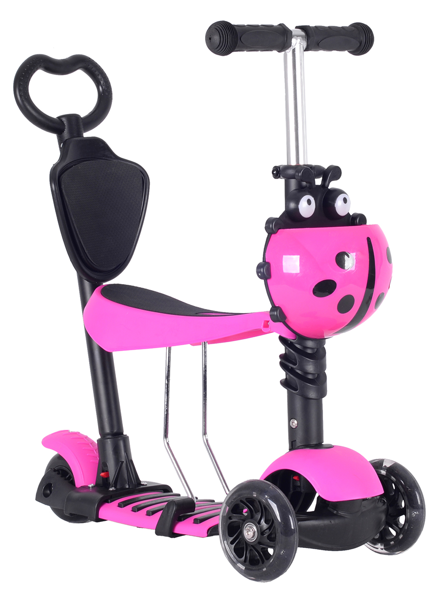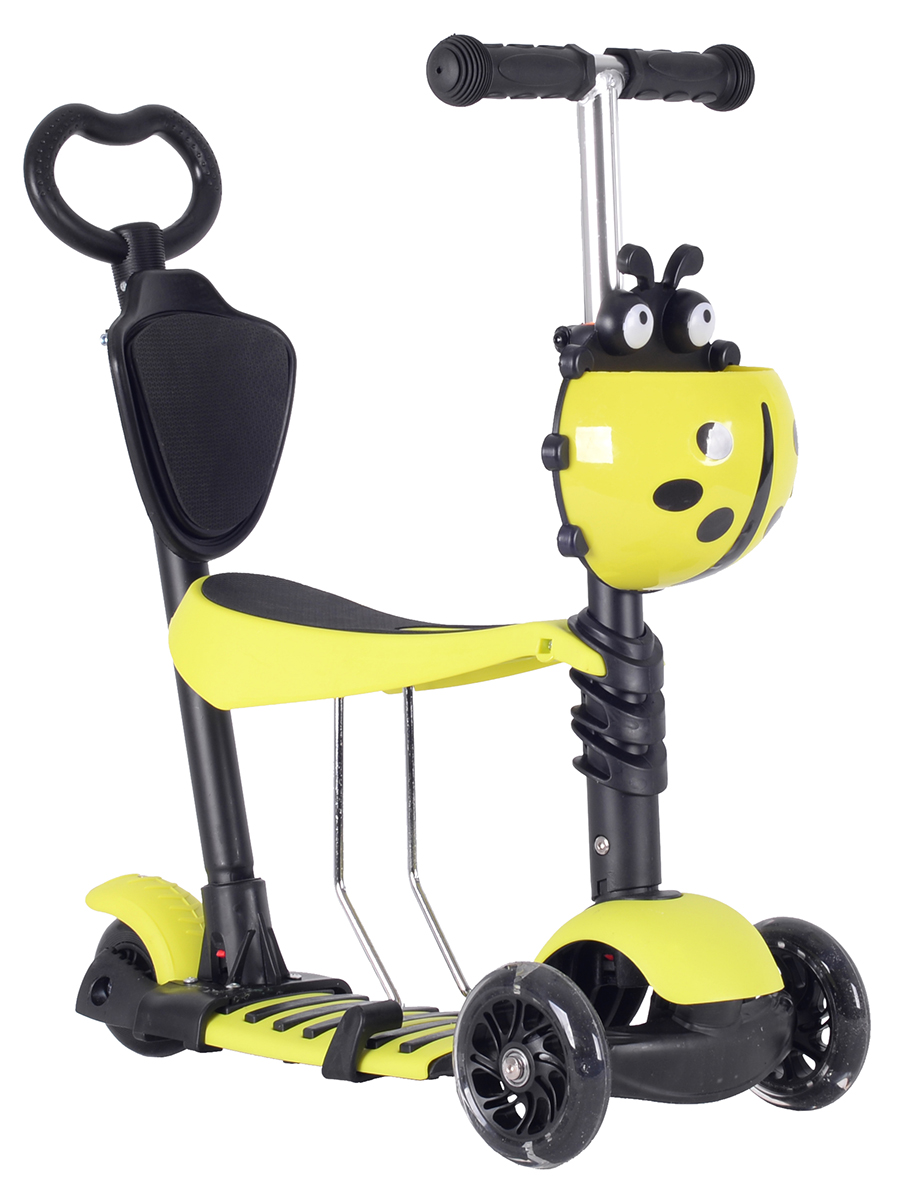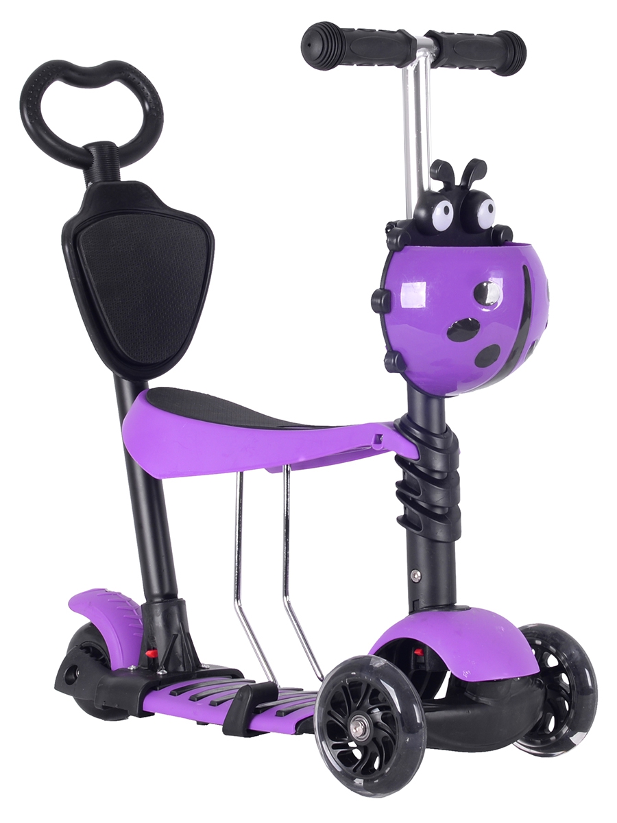 Самокат 5 в 1. Данная модель снабжена съемным детским сиденьем, которое прочно, надежно и безопасно крепится к основе самоката. Наклонная система поворота очень удобна для детей, а также развивает их координацию. Для самых маленьких «гонщиков», а также для их родителей, в комплект уже входит специальная съемная ручка управления, которая снабжена спинкой, комфортно регулируемой по высоте. Детский самокат-трансформер имеет две основные функции, при установленном сиденье — это беговел для совсем маленьких, если сиденье снято — это полноценный самокат. Регулируемая ручка: 65-75 см