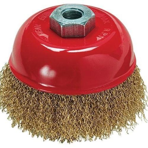 Щетка изготовлена из стальной проволоки. Латунное покрытие. Применяется для очистки металлических поверхностей от ржавчины и грязи в щадящем режиме. Тип посадки – М14.