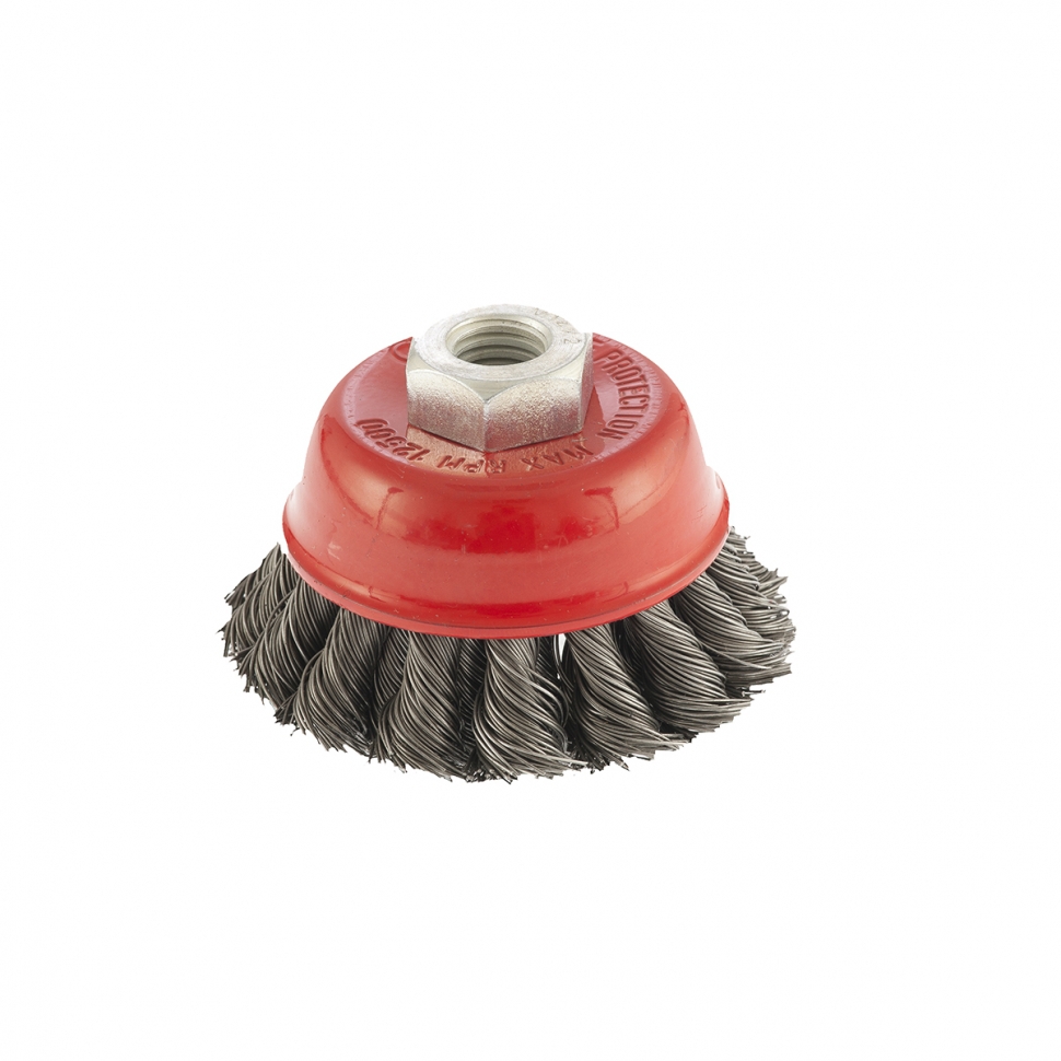 Форма щетки – «чашка», предназначена для производительной обработки значительных по площади поверхностей, удалению краски, ржавчины и других загрязнений. В щетках используется крученая стальная проволока диаметром 0,35, 0,5 или 0,8мм Тип посадки – М14. Два ряда пучков обеспечивают более интенсивную обработку, значительно сокращая время на операцию.