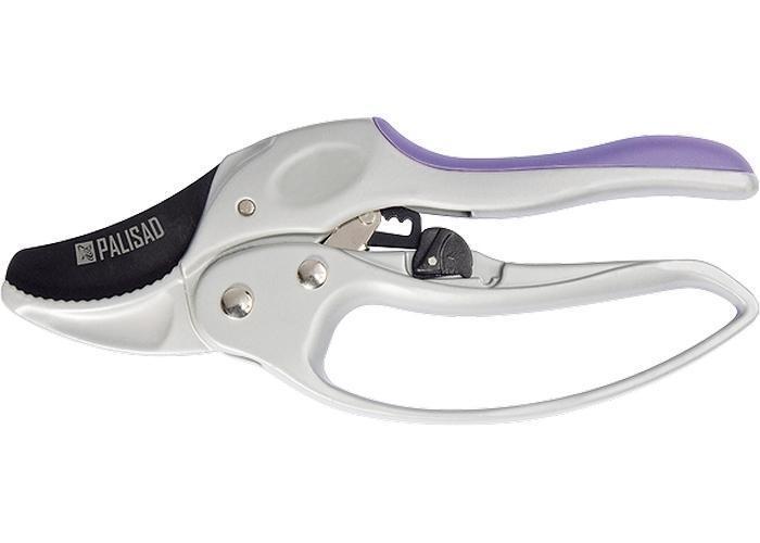 Универсальный секатор с прямым резом, двухкомпонентными рукоятками и фиксатором на нижней рукоятке. Снабжен храповым механизмом, повышающим режущую способность инструмента без увеличения прилагаемого усилия. Защитная дуга предохраняет пальцы от уколов шипов, колючек и мелких веток. Предназначен для выполнения работ по уходу за садом. Рекомендуется для обрезки живых веток диаметром до 20 мм. Зубчики на нижнем лезвии удерживают ветку во время работы. Режущее лезвие изготовлено из инструментальной стали У8, остро заточено с двух сторон и имеет тефлоновое покрытие для защиты от коррозии. Рекомендации по применению: для среза толстой ветки достаточно несколько раз сжать и отпустить рукоятки секатора, не прикладывая большого усилия.
