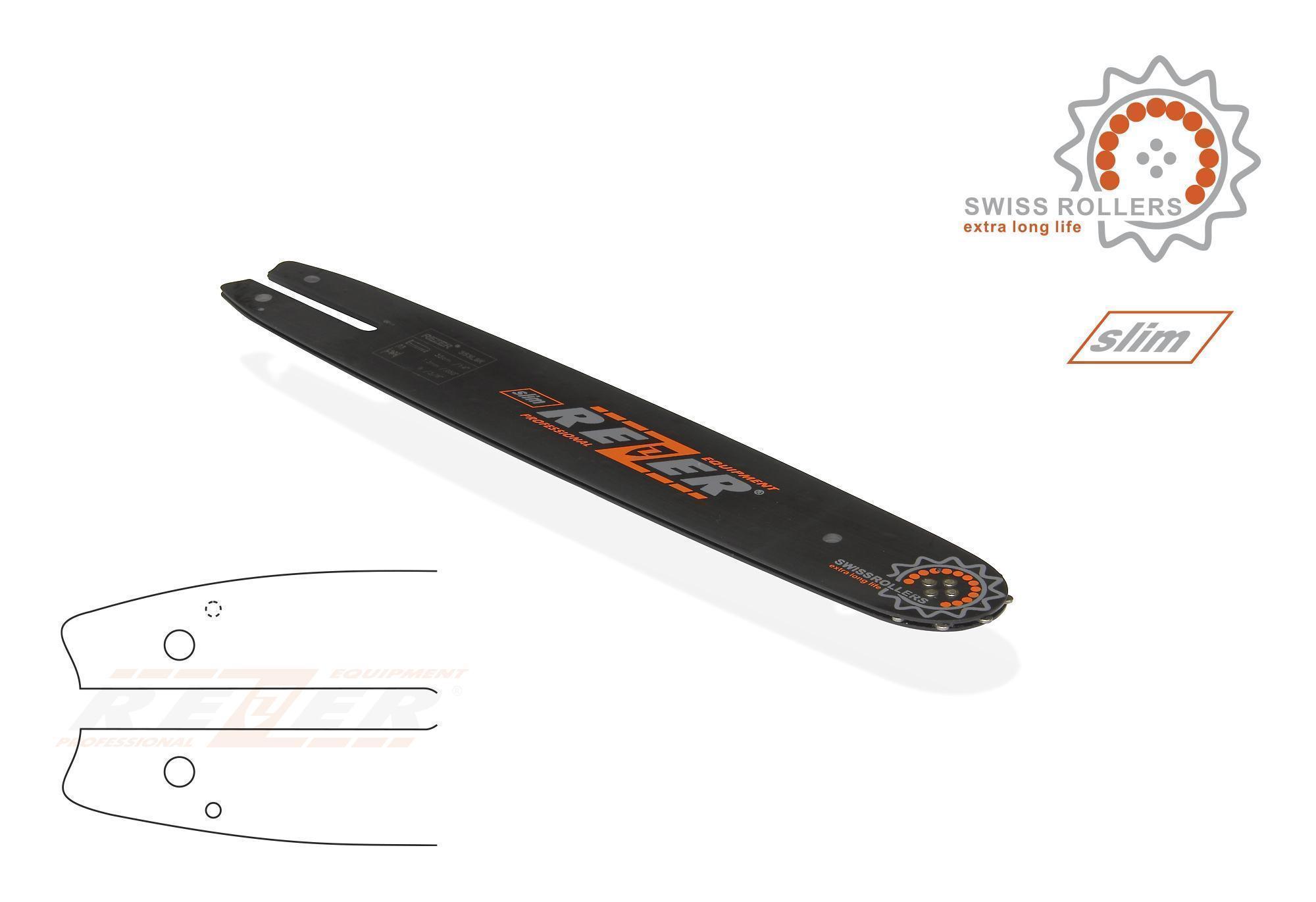Шины Rezer со стандартным профилем для бензопил любительского и полупрофессионального класса и электропил с мощностью до 2,2 кВт. Имеют усиленное крепление ведомой звездочки, что обеспечивает дополнительную устойчивость к нагрузкам и продлевает срок службы. Так же, как шины с узким профилем, имеют узкий паз (slim) и длину от 35 до 50 см.