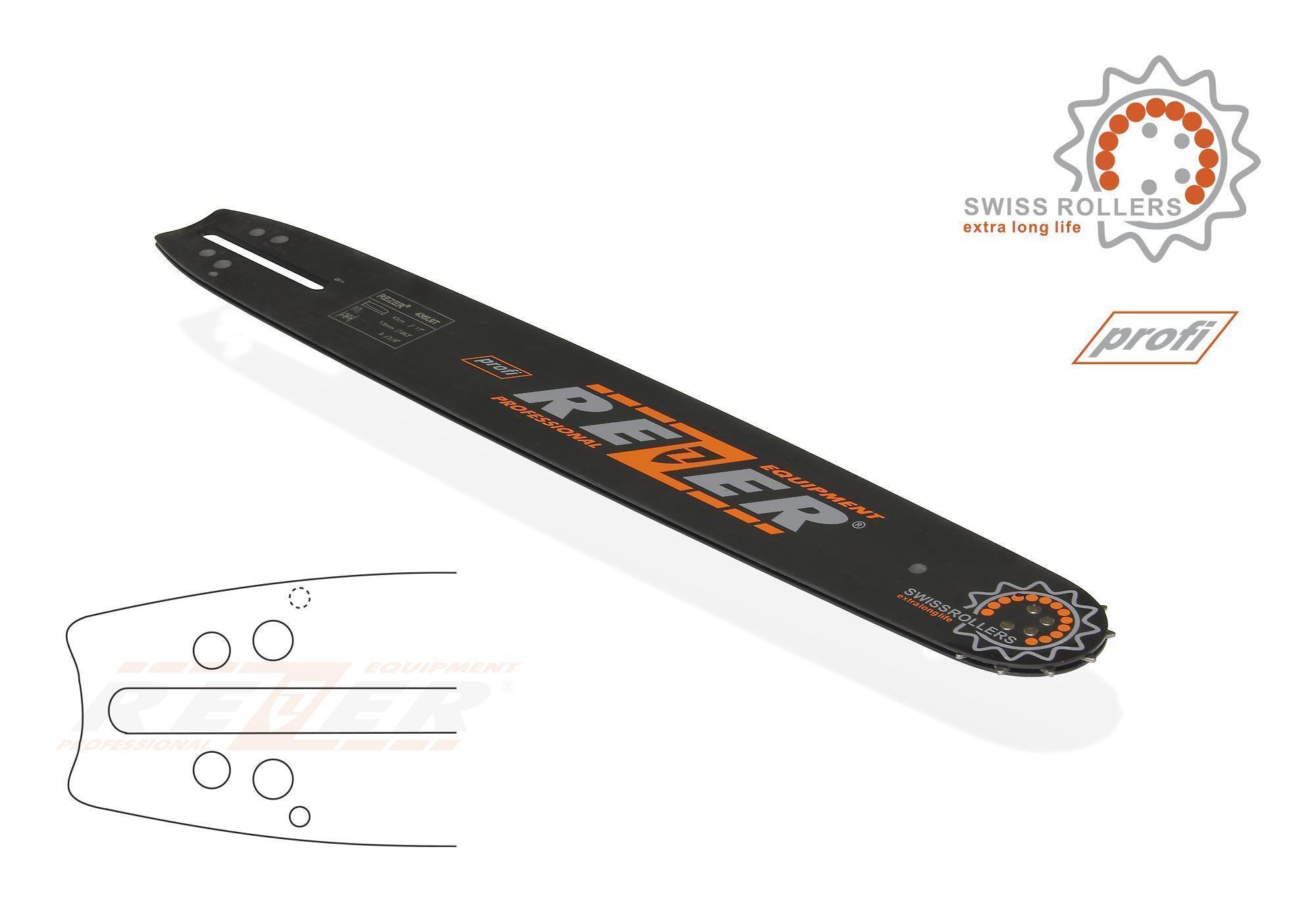 Шины Rezer со стандартным профилем, предназначенные для использования на цепных пилах профессионального класса. Благодаря прочному креплению ведомой звездочки обеспечивается высокая стойкость к нагрузкам и максимальный ресурс. Толщина ведущего звена цепи на направляющих шинах с маркировкой «profi» составляет 1,6 мм/0,063”. Длина от 40 см до 50 см.