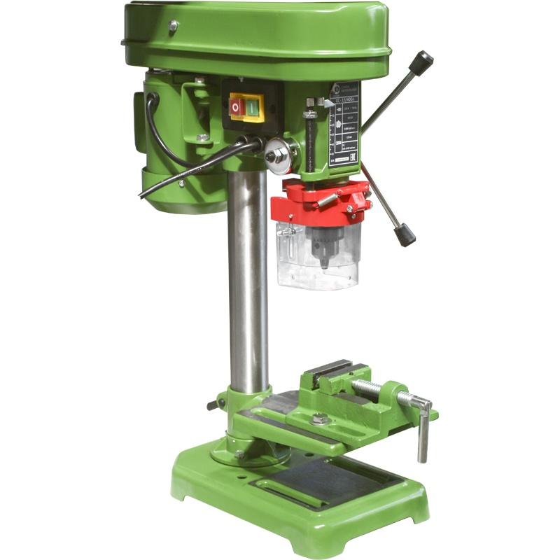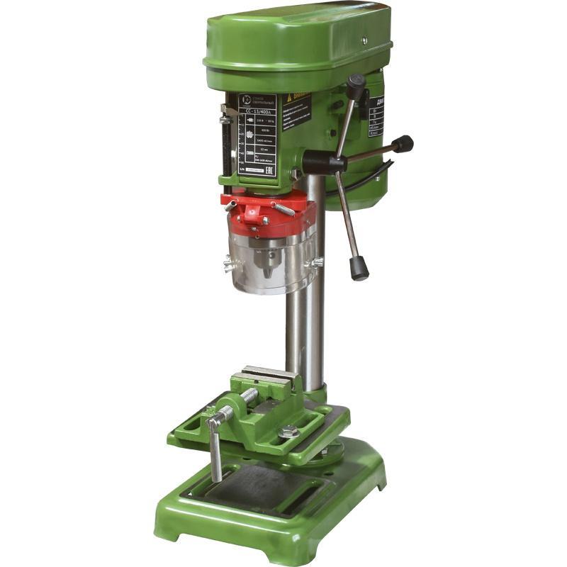 Вертикально-сверлильный станок с ручным управлением Калибр СС-13/400А предназначен для выполнения сверлильных работ по дереву, пластмассе и металлу. Данный станок позволяет выполнять работы с высокой точностью и производительностью. Свёрла, закрепляемые в патроне, являются основным рабочим инструментом для обработки выбранных материалов. В комплект поставки станка входят тиски для фиксации заготовок, крепящиеся к рабочему столу 4-я болтами. Для косого сверления или обработки деталей с неперпендикулярными (наклонными) плоскостями, можно менять угол наклона рабочего стола до 45° (вправо или влево).