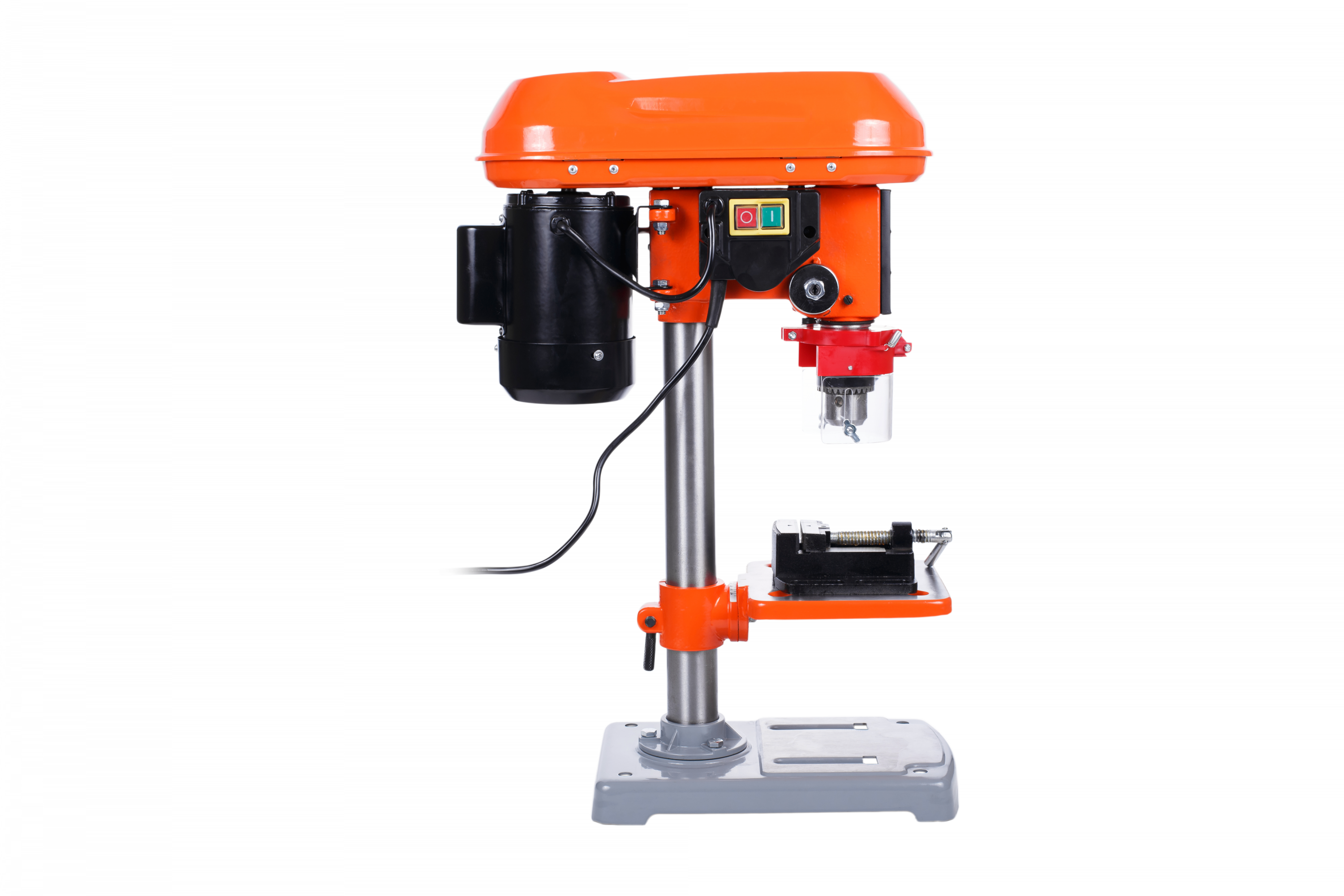 Данный относится к типу универсальных вертикально-сверлильных деревообрабатывающих одношпиндельных станков. Станок предназначен для сверления отверстий в древесине и других различных материалах. Надежный асинхронный электродвигатель. Регулируемый откидной защитный экран для безопасной работы. Рабочий стол способен перемещаться в вертикальном направлении. В комплект входят тиски. Основные технические данные: Номинальная потребляемая мощност: 550 Вт Диапазон частоты вращения шпинделя: 420 – 2700 минˉ¹ Ряд частоты вращения шпинделя: 420/600/770/900/1100/1400/1980/ 2200/2700 минˉ¹ Число ступеней частоты вращения шпинделя: 9 Диапазон диаметров хвостовиков режущего инструмента зажимаемых в сверлильный кулачковый патрон: Ø 3–16 мм Посадочное конусное отверстие сверлильного патрона: В16 Максимальный ход шпинделя: 50 мм Размер рабочего стола: 175 × 175 мм Размер станочных тисков: 2,5” Габаритные размеры: 440 × 230 × 635 мм Масса: 15,4 кг Кратность упаковки: 1-1-1 Комплектность: Станок сверлильный — 1 шт. Тиски станочные — 1 шт. Инструкция по эксплуатации — 1 экз. Коробка картонная упаковочная — 1 шт.