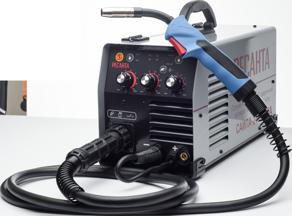 Сварочный полуавтомат Ресанта САИПА-24В/200А – источник питания инверторного типа, функционирующий на постоянном токе. Прибор разработан для сваривания движущим проволочным электродом в аргонной, углекислой среде, либо плавящимся, с рутиловым покрытием – способом ММА (ручная дуговая сварка).