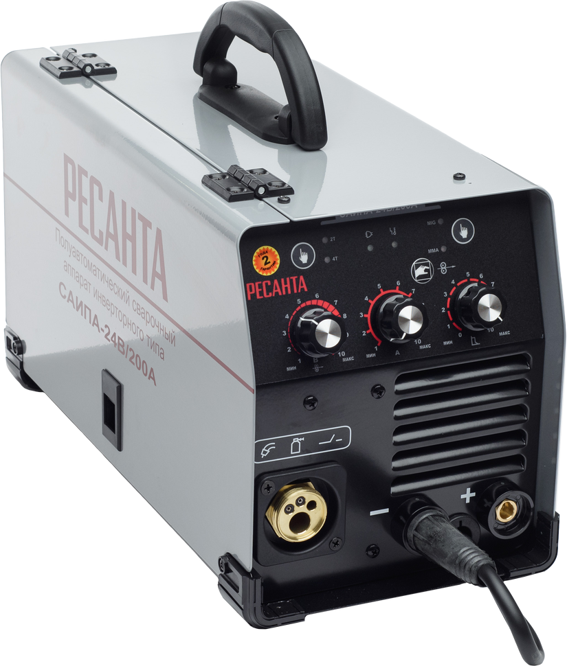 Для защиты прибора Ресанта САИПА-24В/200А от перегрева при длительной эксплуатации аппарата на максимальном токе, внедрено автоматическое отключение со световой индикацией. На панели предусмотрены регуляторы основных параметров: скорость подачи проволоки, регулирование напряжения, величины сварочного тока, в диапазоне от 30 до 200 Ампер.