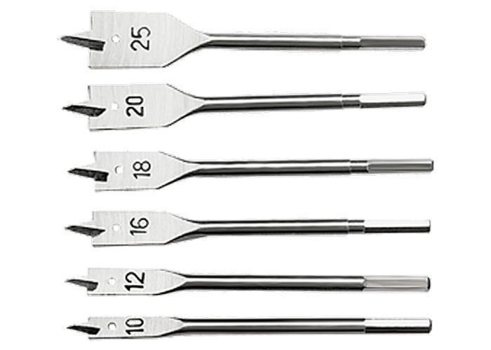 Перовые сверла изготовлены из углеродистой стали. Твердость режущих кромок 45HRc. Предназначены для сверления отверстий в древесине. Комплектация: 10-12-14-16-18-20-25 мм. Хвостовики имеют шестигранную форму, что предотвращает поворот сверла. Центрирующее остриё исключает необходимость в предварительном засверливании.