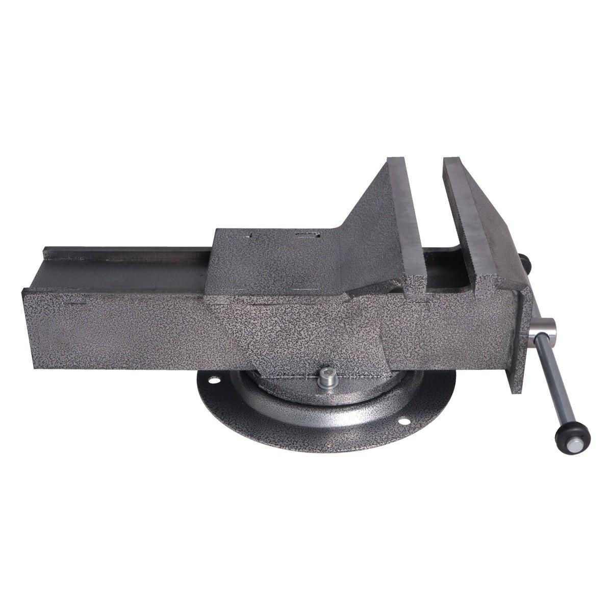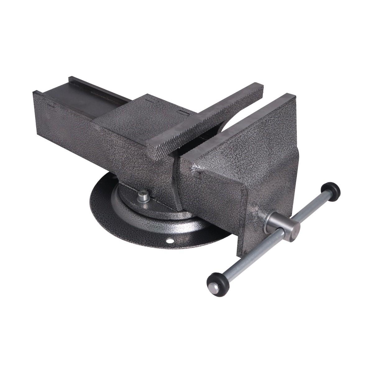 Массивный корпус из стального сплава и основание покрыты краской, защищающей тиски от коррозии, что увеличивает их рабочий ресурс. Зажимные губки выполнены из закалённой стали высокого качества. Корпус, с возможностью поворота на 360 градусов относительно основания, способствует удобной обработке заготовки. Предусмотрено крепление основания к верстаку (рабочему столу) тремя болтами.