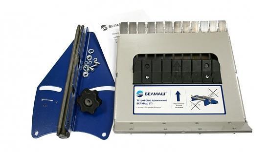 Устройство прижимное БЕЛМАШ УП-04 предназначено для безопасной обработки при строгании заготовок толщиной менее 60 мм. Используется на станках БЕЛМАШ СДМП-2200. Крепление устройства на станок осуществляется с помощью винтов и шайб. Настройка устройства выполняется с помощью ручки зажима в верху и ручки пружинного блока сбоку в соответствии с требуемой толщиной заготовки или усилием ее прижатия.