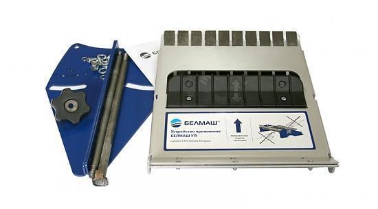 Устройство прижимное БЕЛМАШ УП-05 предназначено для безопасной обработки при строгании заготовок толщиной менее 60 мм. Используется на станках БЕЛМАШ УНИВЕРСАЛ-2000, БЕЛМАШ СДМК-2000. Крепление устройства на станок осуществляется с помощью винтов и шайб. Настройка устройства выполняется с помощью ручки зажима в верху и ручки пружинного блока сбоку в соответствии с требуемой толщиной заготовки или усилием ее прижатия.