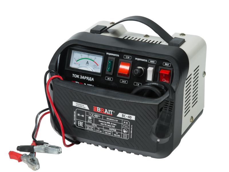 Зарядное устройство BRAITBC-40 Может зарядить батарею ёмкостью 80\320 Ач. У зарядного устройства есть защита короткого замыкания, защита обратного подключения, защита низкого напряжения. С учетом состояния заряжаемой батареи применяется быстрая либо плавная зарядка. Увеличивает время работы аккумулятора. Уменьшает долю потери электролита, устраняя нагрев батареи.